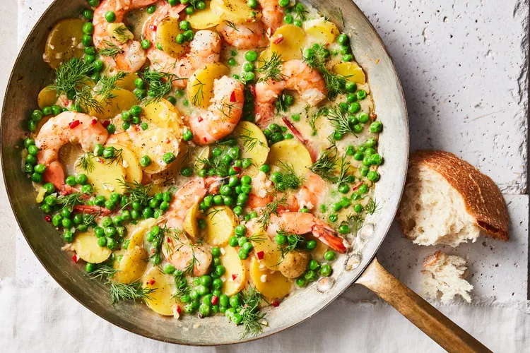 Unlike their larger, late-season siblings, baby veggies are supremely quick to cook. Creamy new potatoes add substance to this quick one-pan skillet dinner of tender shrimp, fresh shelling peas, and dill, which come together in a sweet and buttery broth laced with cream.